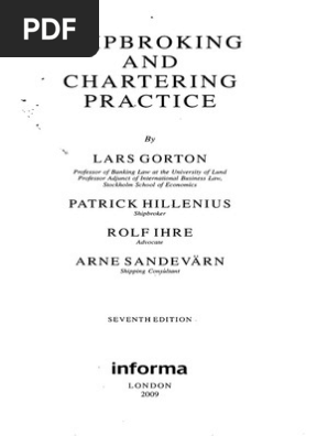 Shipbroking and chartering practice download shipbroking and chartering practice or read online books in pdf epub tuebl and mobi format. Shipbroking and chartering practice by lars gorton professor of banking law at the university of lund professor adjunct of international business law stockholm school of economics patrick hillenius shipbroker rolfihre advocate arnesandevarn shipping consultant seventh edition informa london 2009. Scribd is the worlds largest social reading and publishing site. It covers the role and the working practices of shipbrokers and charterers with a clear picture of the state of the market and coverage of future developments.