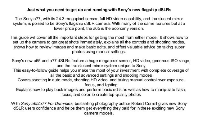 By robert correll. Click download or read online button to get sony alpha slt a65 a77 for dummies book now. By robert correll. What shooting mode should you use.